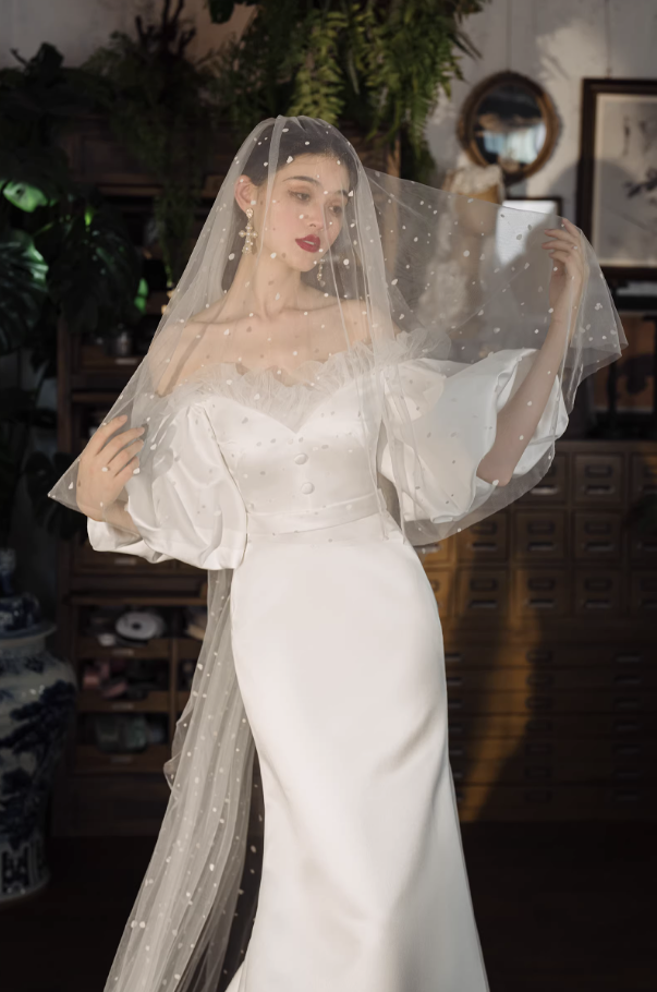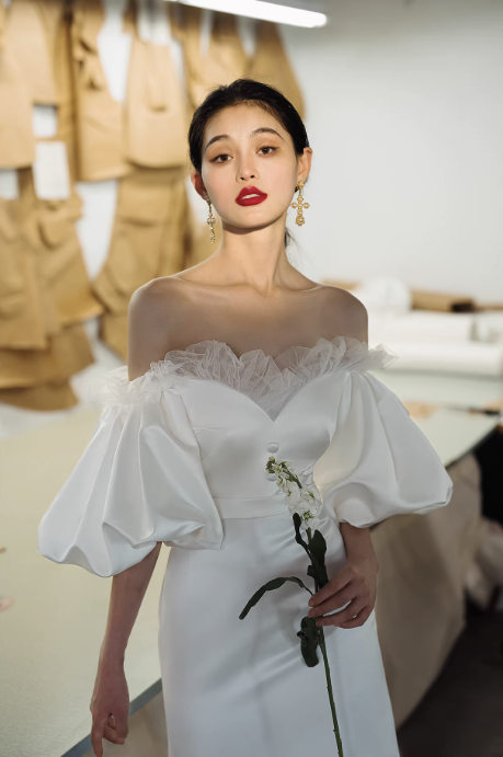 - Kiểu cổ: Trễ vai kết hợp voan mềm