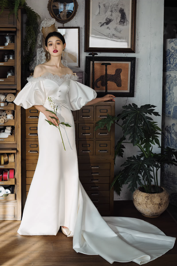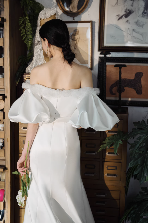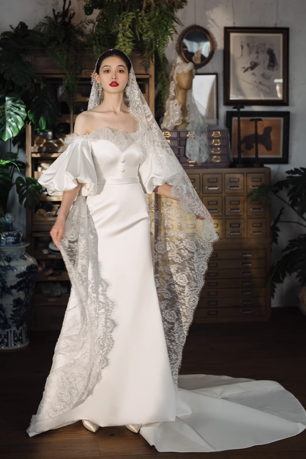 Mẫu váy cưới mang phong cách thanh lịch và cổ điển, nổi bật với thiết kế trễ vai giúp tôn lên bờ vai và xương quai xanh quyến rũ. Phần cổ được nhấn bằng lớp voan mềm mại tạo hiệu ứng nhẹ nhàng, nữ tính và sang trọng.