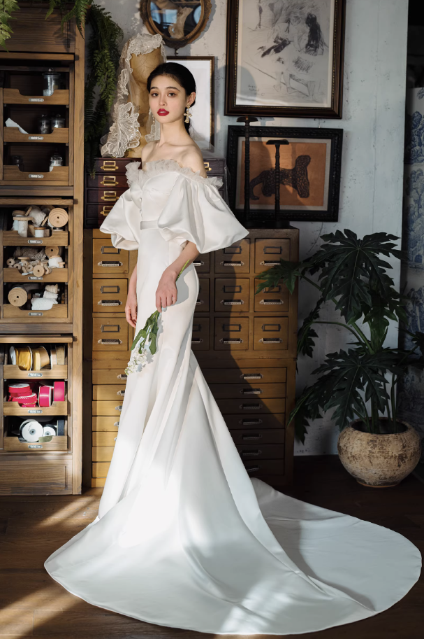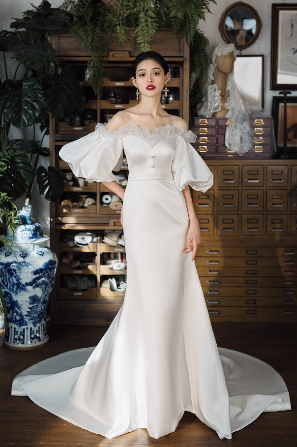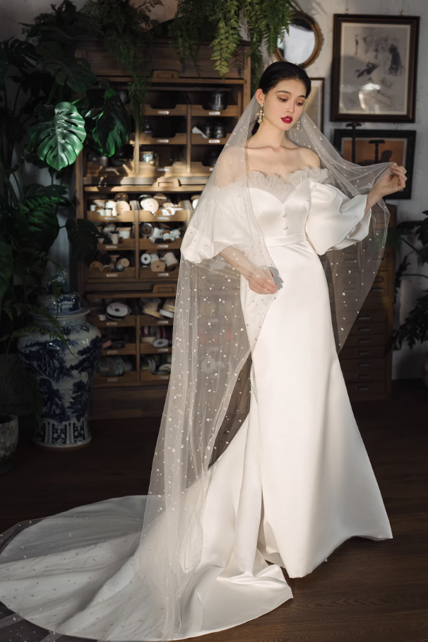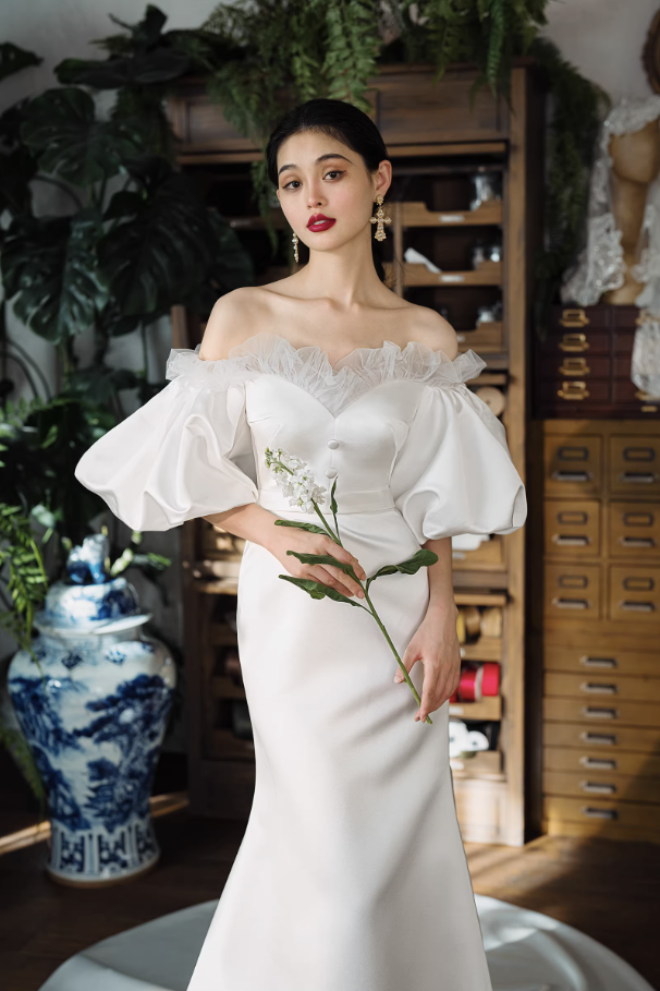 Chân váy dáng dài ôm nhẹ, rủ mềm xuống phía dưới giúp tôn dáng và tạo sự thướt tha khi di chuyển. Thiết kế phù hợp cho nhiều phong cách lễ cưới như tiệc cưới trong nhà, chụp ảnh cưới hoặc lễ cưới phong cách cổ điển.