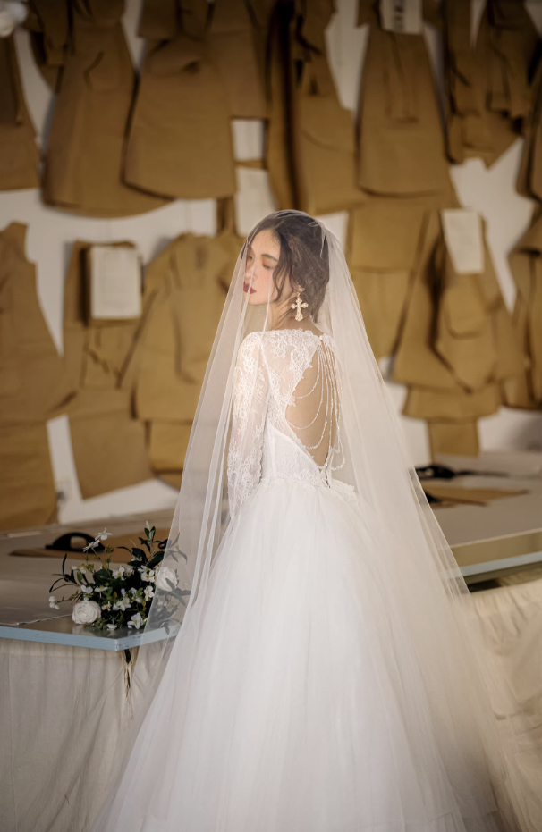 Thiết kế váy cưới mang phong cách thanh lịch – tinh tế – sang trọng, nổi bật với phần ren may thủ công cùng form váy công chúa bồng nhẹ giúp cô dâu trở nên mềm mại và cuốn hút trong ngày trọng đại.