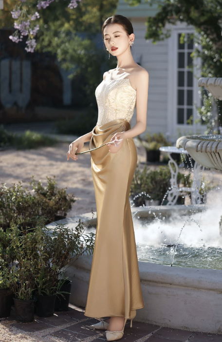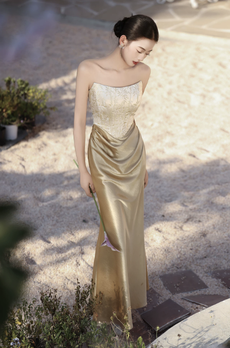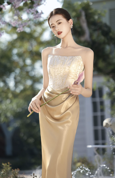 Phần thân trên nổi bật với họa tiết thêu tinh xảo, tạo điểm nhấn nhẹ nhàng nhưng vẫn đủ nổi bật. Chất liệu satin cao cấp có độ bóng nhẹ, bề mặt mịn, mang lại cảm giác mềm mại và sang trọng khi mặc.