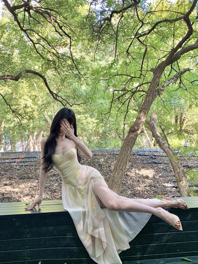 Chân váy voan nhiều lớp rủ nhẹ, tạo độ bay bổng khi di chuyển, mang lại cảm giác mềm mại và thướt tha. Gam màu vàng kem dịu nhẹ giúp tổng thể trở nên thanh lịch, dễ mặc trong nhiều dịp.