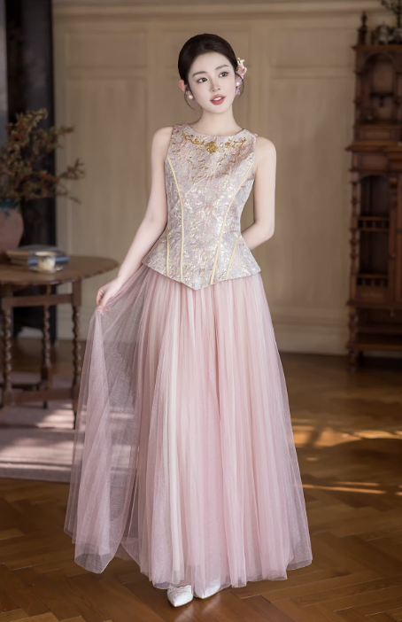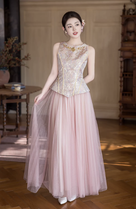Chân váy phối lớp voan mềm mại, xếp ly tự nhiên, tạo độ bồng bềnh và chuyển động uyển chuyển khi di chuyển. Form dáng dài giúp tổng thể trở nên thanh thoát, phù hợp với nhiều dáng người và dễ tạo hiệu ứng “cao – gọn”.