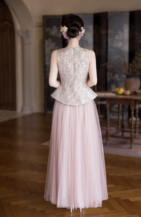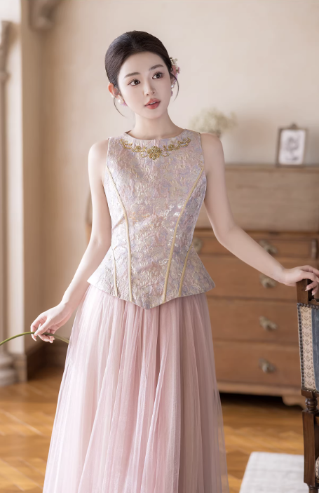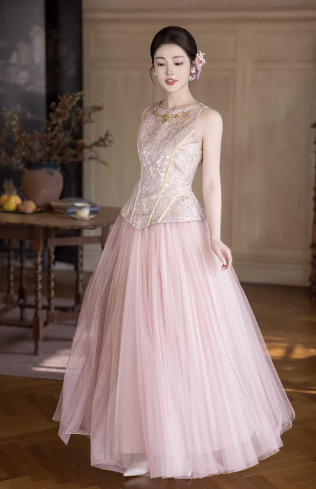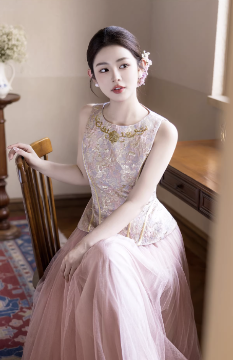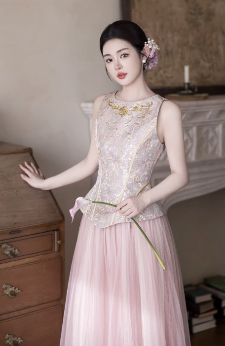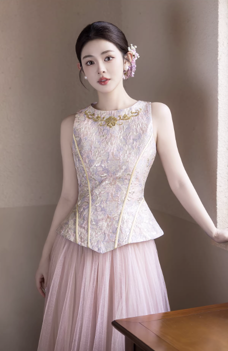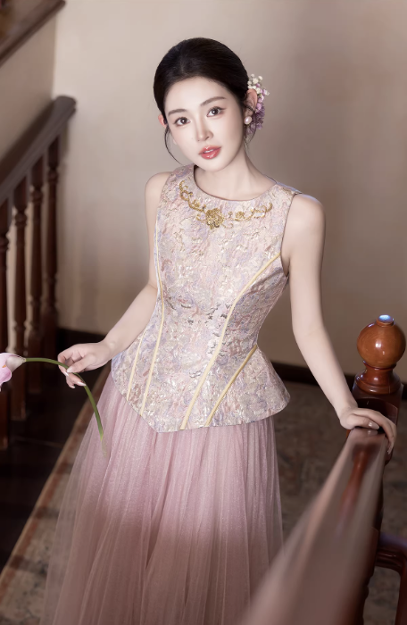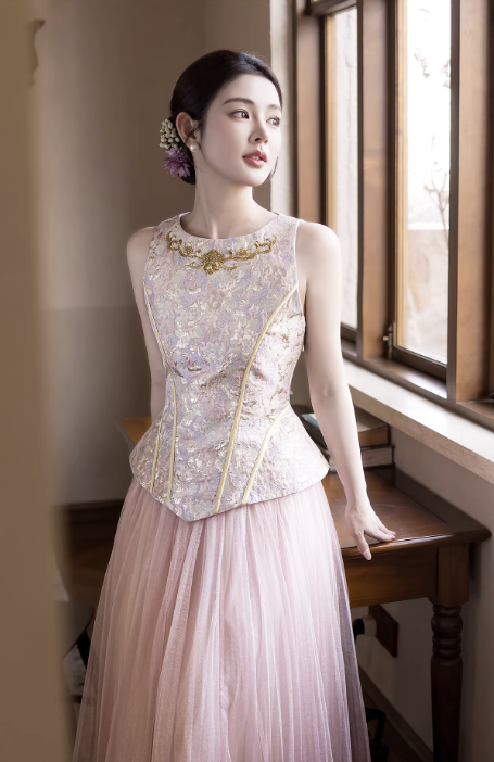 Phần thân trên dáng corset ôm nhẹ, giúp tôn vòng eo và định hình vóc dáng gọn gàng. Bề mặt được xử lý họa tiết thêu tinh xảo, tạo điểm nhấn sang trọng nhưng vẫn giữ được sự nhẹ nhàng, nữ tính.