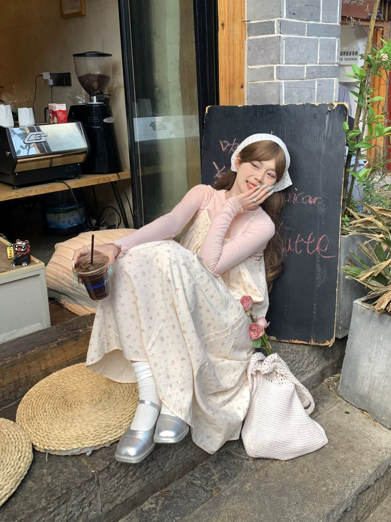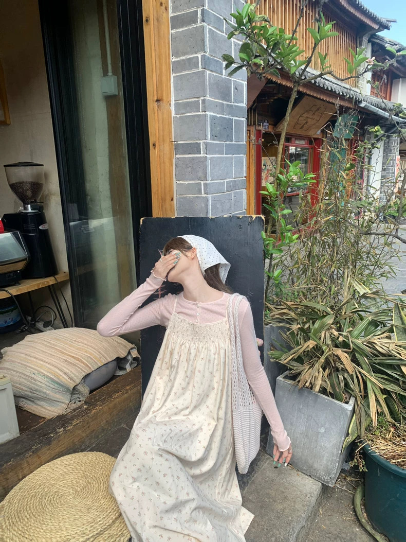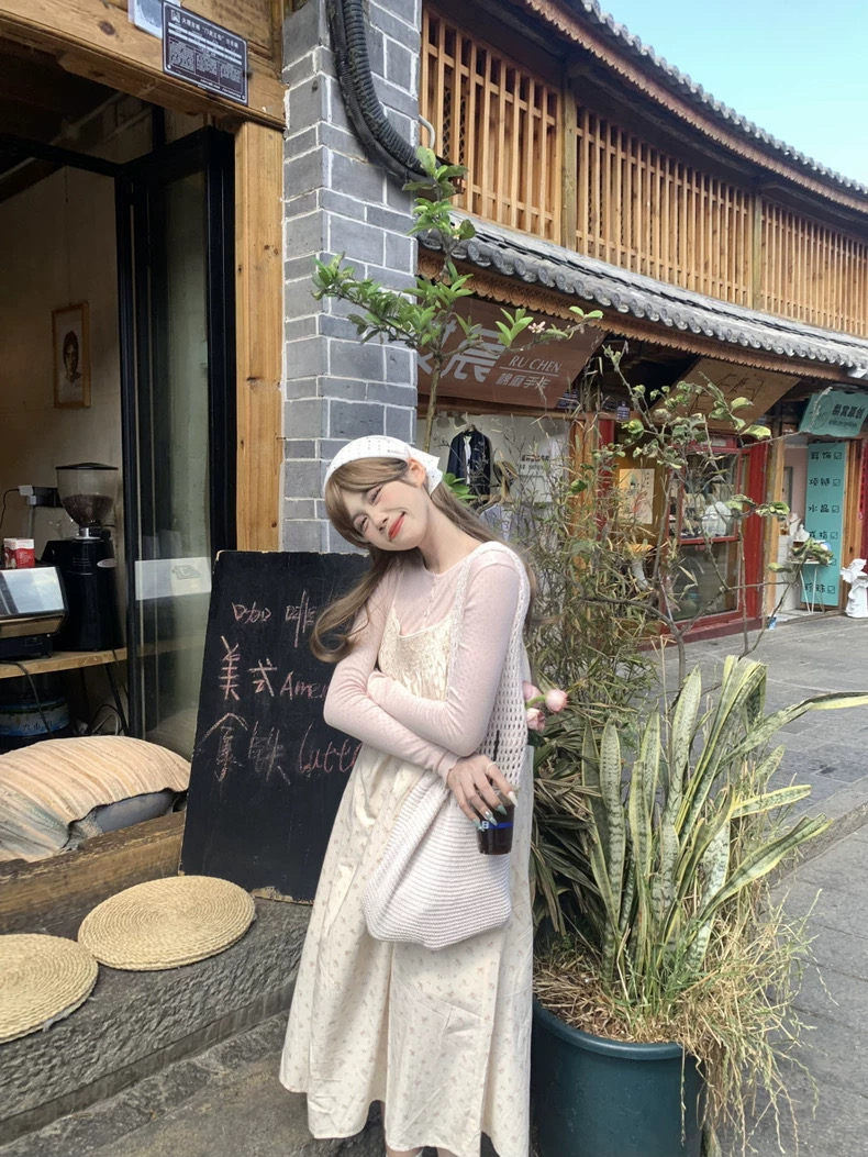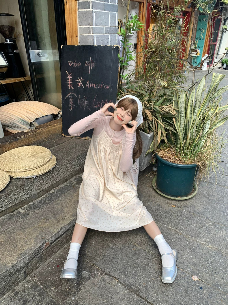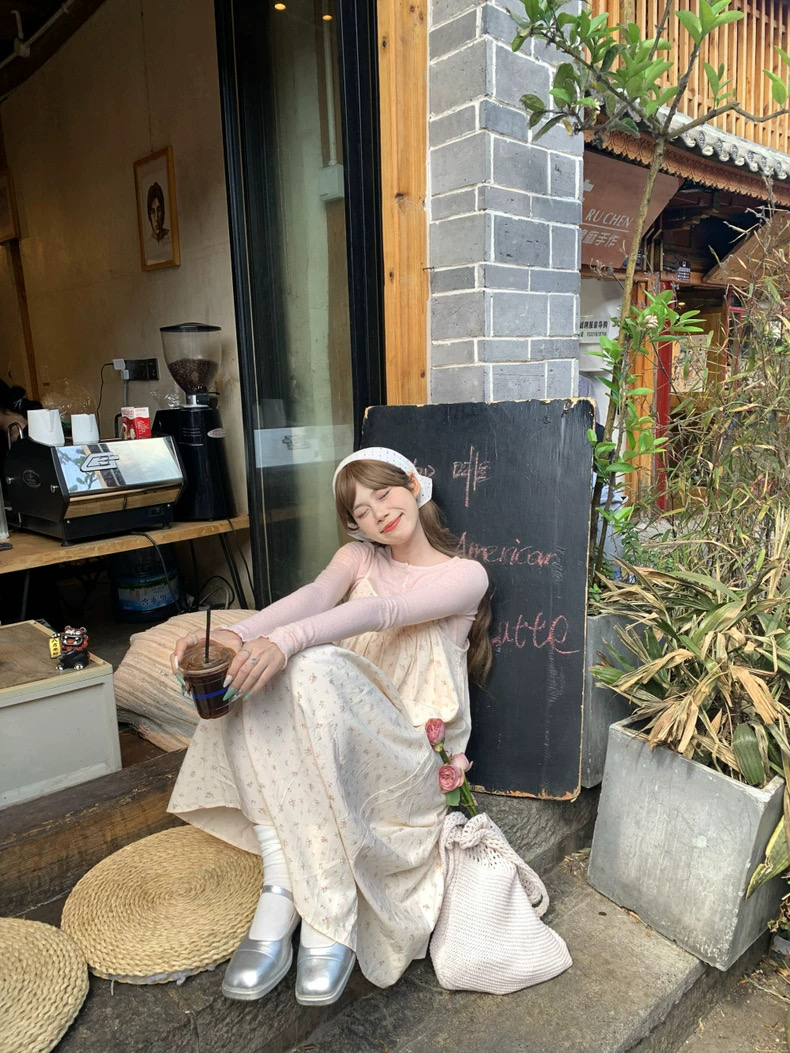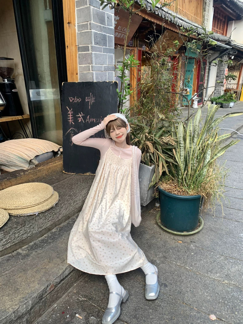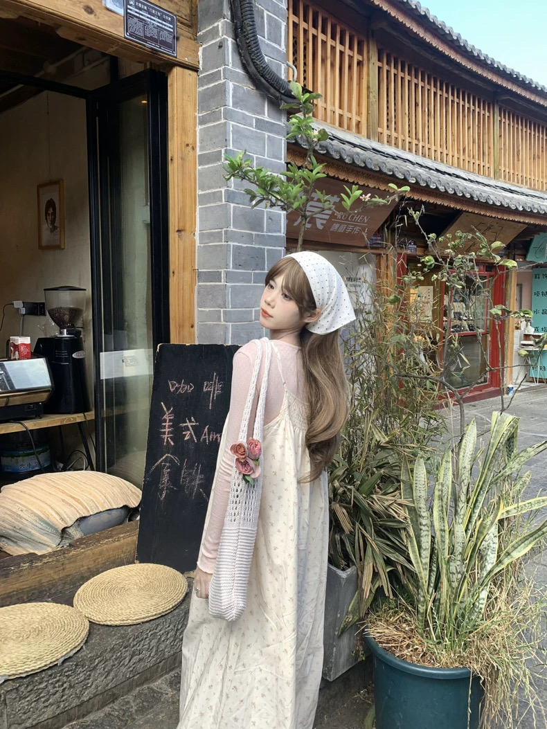Thiết kế gồm váy 2 dây dáng dài phối cùng áo tay dài mỏng, tạo cảm giác dịu dàng – thanh lịch, chuẩn vibe nàng...